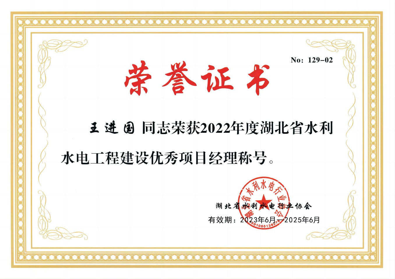 王進(jìn)國被評(píng)為2022年度湖北省水利水電工程建設(shè)優(yōu)秀項(xiàng)目經(jīng)理