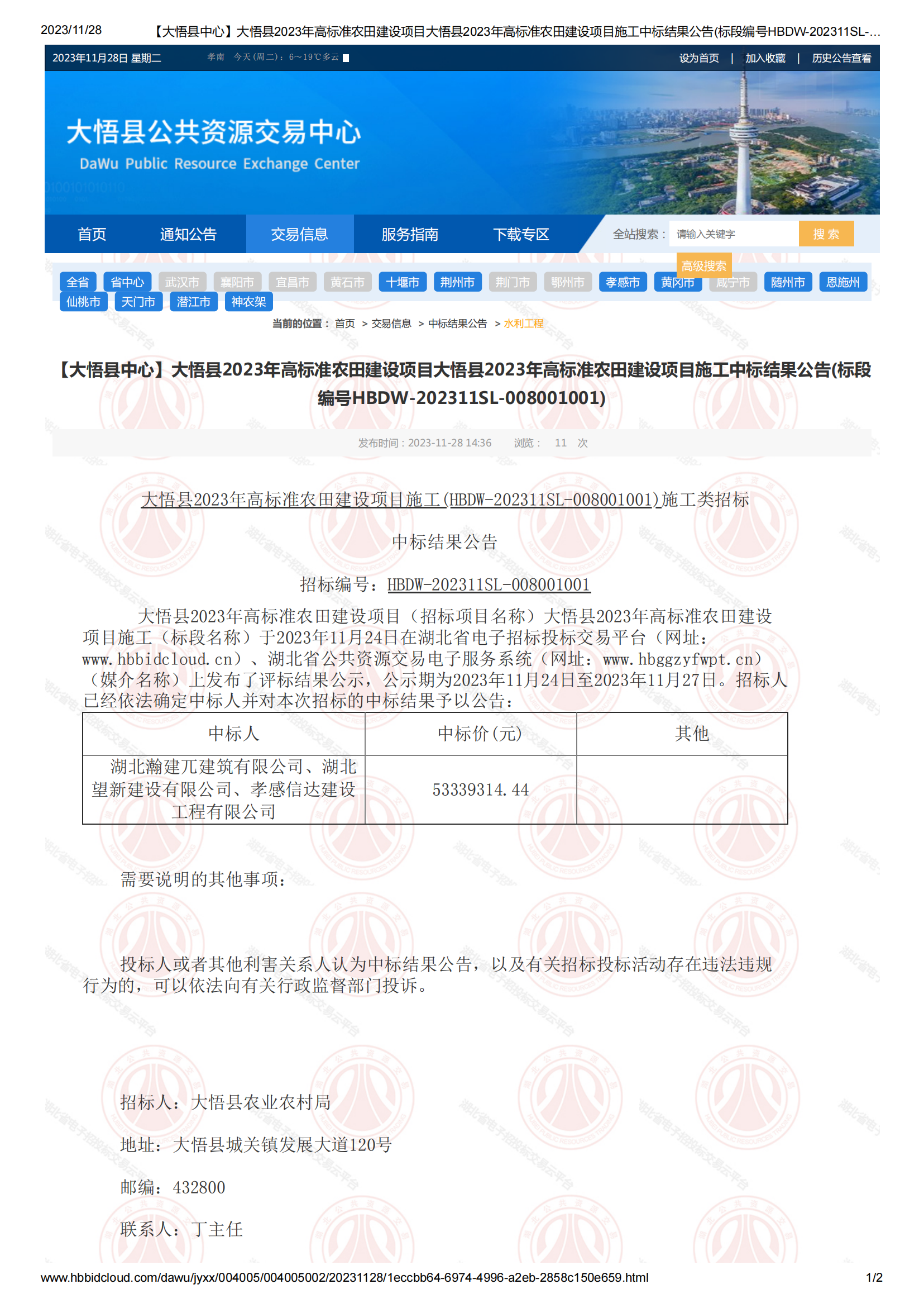 項(xiàng)目名稱:大悟縣2023年高標(biāo)準(zhǔn)農(nóng)田建設(shè)項(xiàng)目施工
